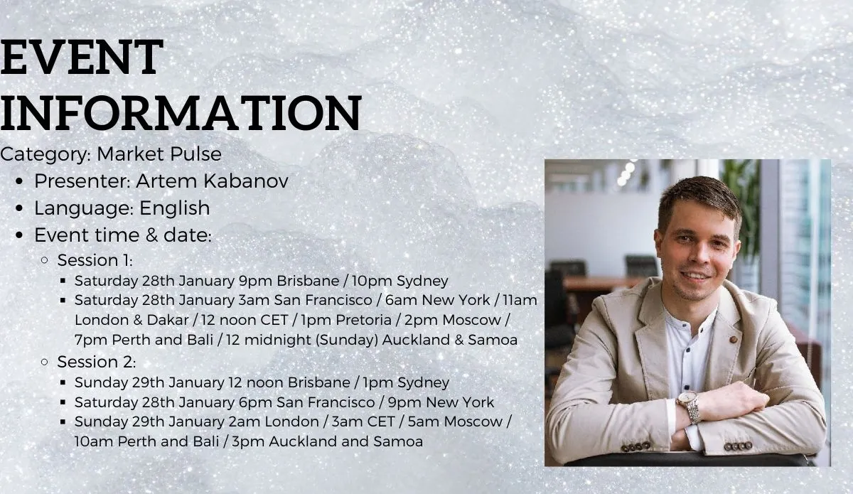 Session 1 - Fri Jan 28th 9pm Brisbane / 10pm Sydney / 3am San Francisco / 6am New York / 11am London and Dakar / 12 noon CET / 1pm Pretoria / 2pm Moscow/ 7pm Perth and Bali / 12 midnight (Sunday) Auckland and Samoa | Session 2 - Sun Jan 29th 12 noon Brisbane / 1pm Sydney / 2am London / 3am CET / 5am Moscow / 10 am Perth and Bali / 3pm Auckland and Samoa / Sat 28th Jan 6pm San Francisco / 9pm New York